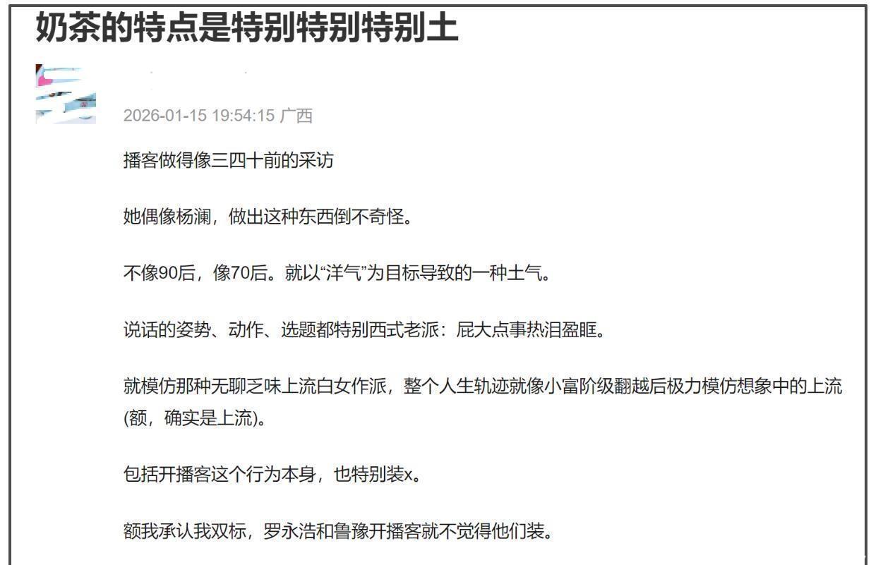 说到底,她做播客恐怕不是为了倾听或碰撞,更像是借平台传递自己想说的话。访谈本该以对方为中心,她却总在找机会插进自己的叙事,不管话题是否契合,也不管节奏是否自然。这种强烈的自我导向,让整个对话显得别扭又失衡。